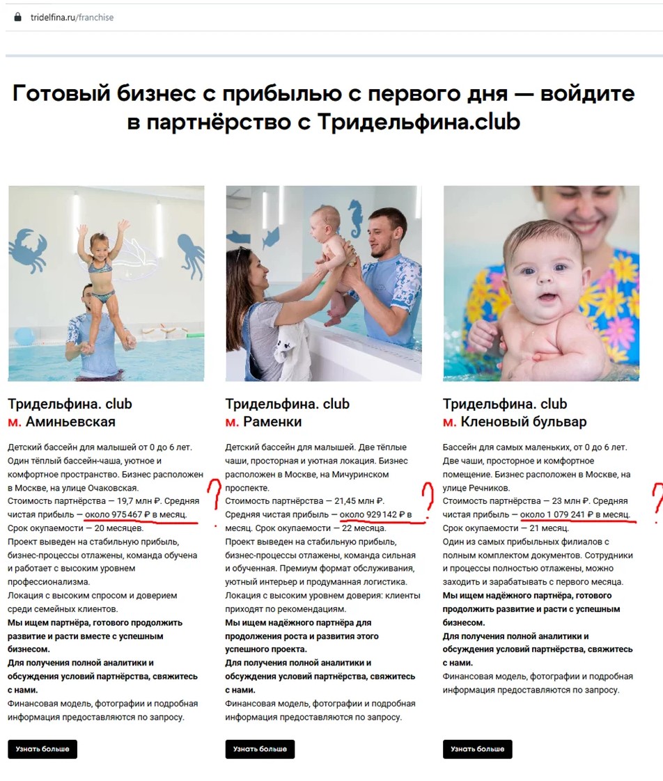 5. На сайте tridelfina.ru по адресу https://tridelfina.ru/franchise указан список бассейнов в Москве с приглашением другим инвесторам поучаствовать, "войти в партнерство". При этом указана прибыльность филиалов (для примера указаны три филиала, см. скрин) – около 1 млн.р. в месяц на филиал. Вероятно, такая прибыльность и была бы, если бы стоимость одного занятия соответствовала рынку.